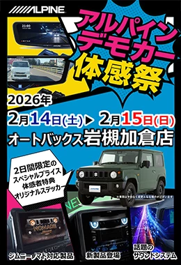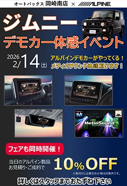 アルパインジムニー専用商品をご体感頂けます‼期間中はイベント特典としてジムニー専用10型ナビ/メティオサウンド/デジタルミラーが10%OFFにてご購入頂けます‼ぜひスーパーオートバックス広島観音新町店へお越しください!!