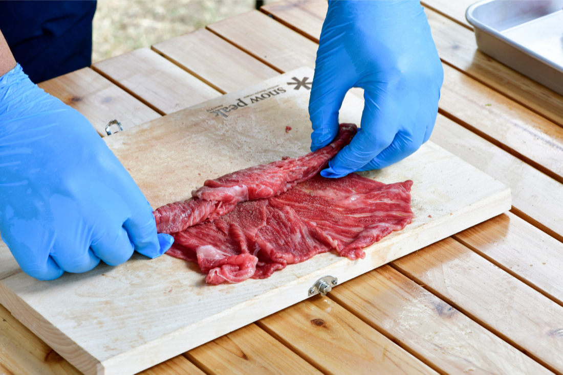 07|そして、もう一回、牛ロースをまな板に並べて、お肉をクルクルします。