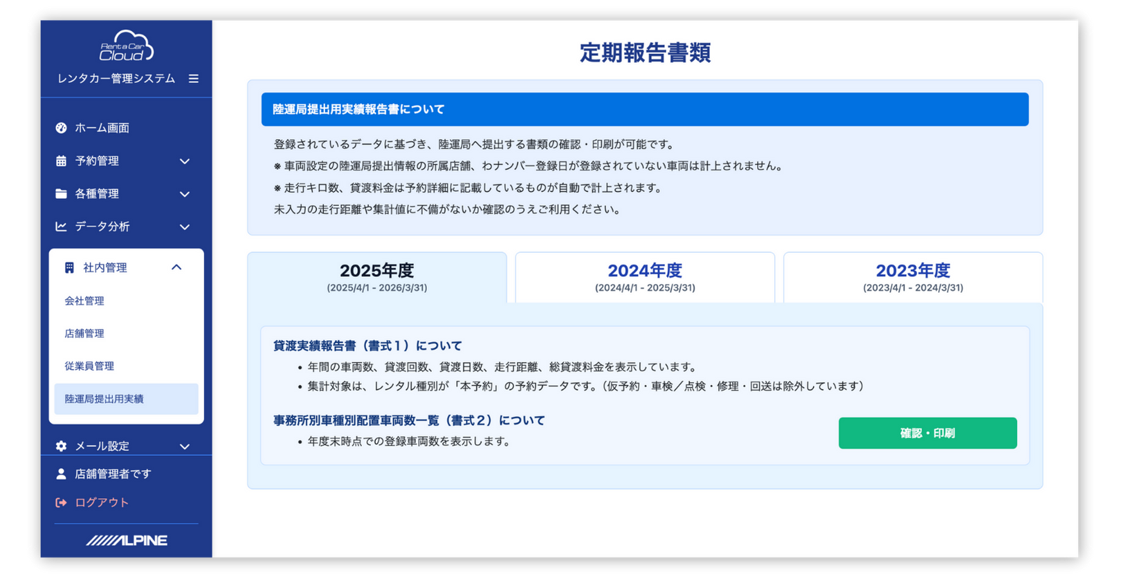 日々の業務を集計して「貸渡実績報告書」「配置車輌数一覧表」を自動生成 |