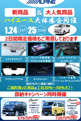 アルパインの”新製品”を体感できます!話題のメティオサウンドもジムニーで体感!ハイエースには、新製品も装着しています!この2日間をお見逃しなく!ご来店お待ちしております!
